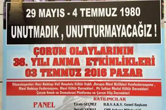 Türkiye tarihine kara bir leke olarak geçen Çorum Olayları’nın 36. yıl dönümü dolayısıyla 3 Temmuz Pazar günü Çorum‘da çeşitli anma etkinlikleri düzenlenecek. Hacı Bektaş Veli Anadolu Kültür Vakfı Çorum Şubesi ve Çorum Alevi Kültür Merkezi‘nin öncülüğünde gerçekleştirilecek etkinliklere bu yıl…