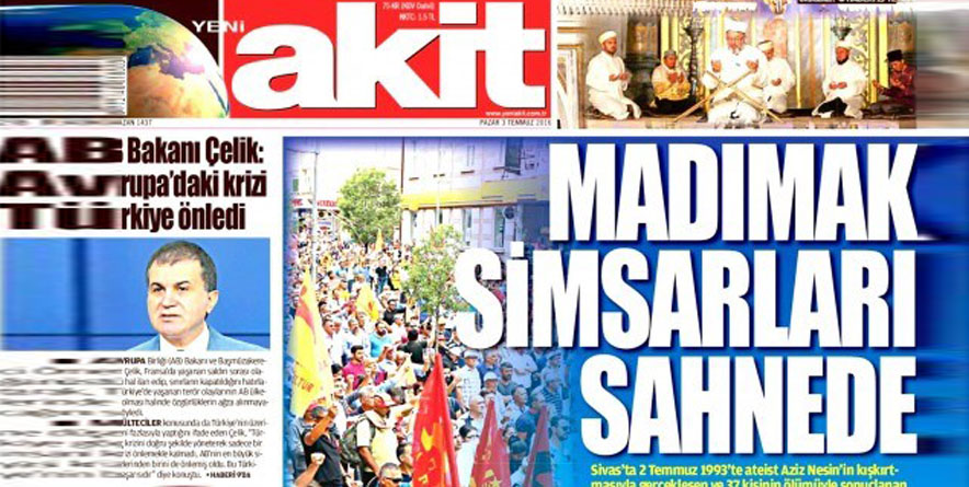 Akp‘ye yakınlı ile bilinen gerici, yobaz yeni Akit gazetesi, Sivas 2 Temmuz 1993’te yakılarak katledilen 33 aydını hedef alan bir manşetle güne başlayarak kin dolu kindar nesil olduğunu bir kez daha göstermiş oldu. Manşetini “Madımak simsarları sahnede” olarak atan Akit, katliamın Aziz Nesin‘in…